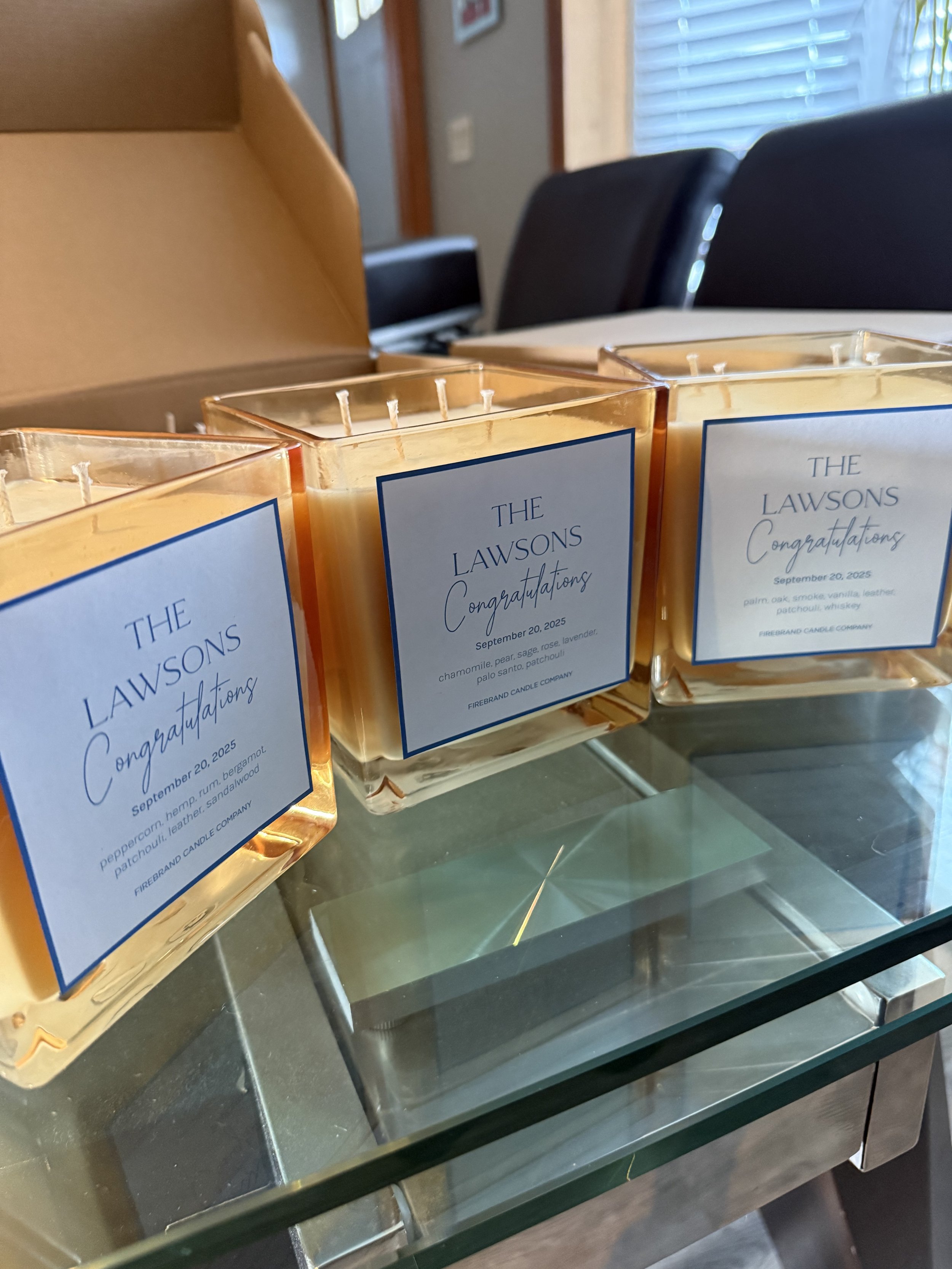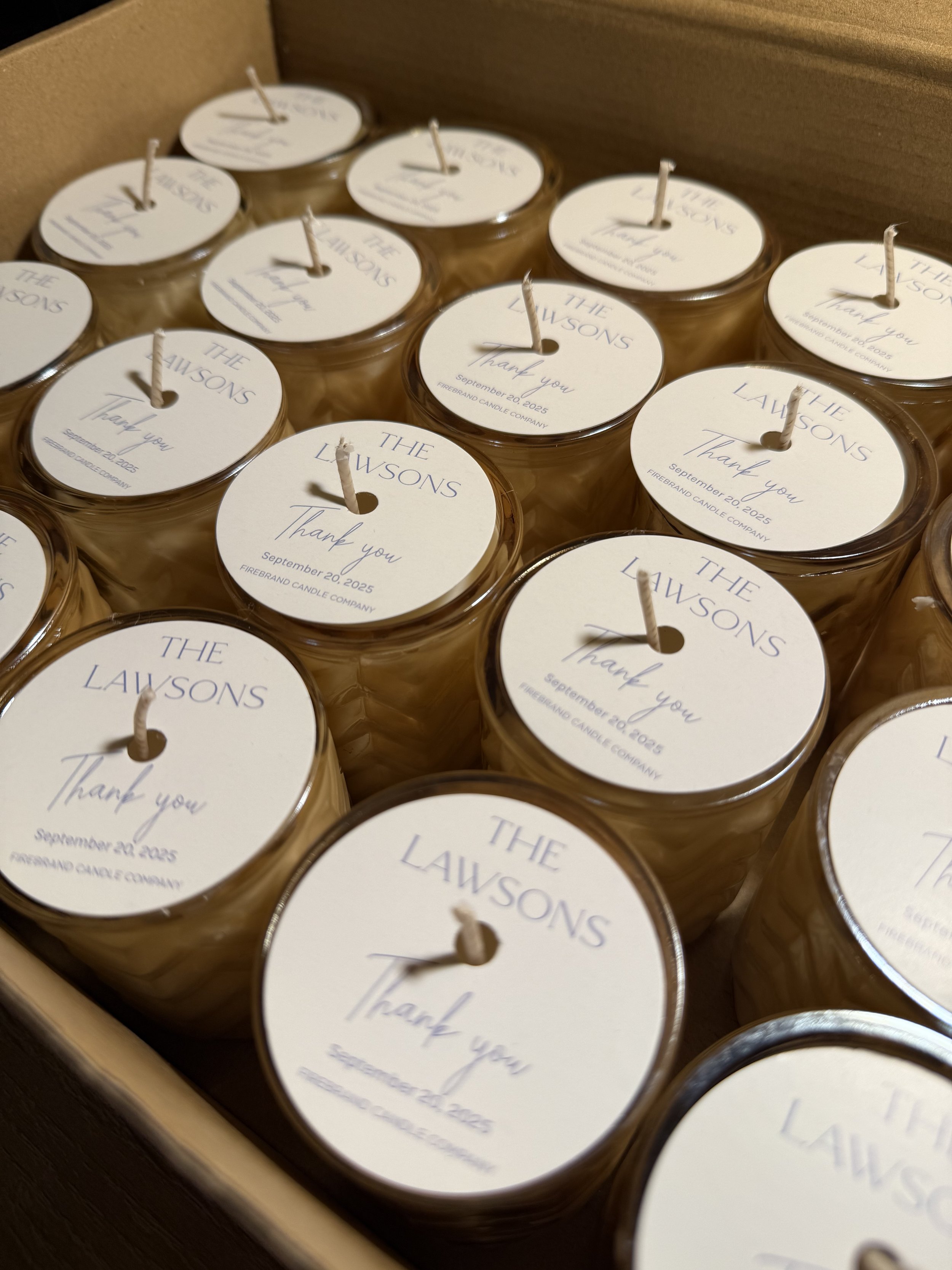 Whether it’s a custom scent to go with the theme of your event or a completely custom candle from the container, to the scent, to the packaging, I can help. Scroll down to learn more and submit info about your vision.
