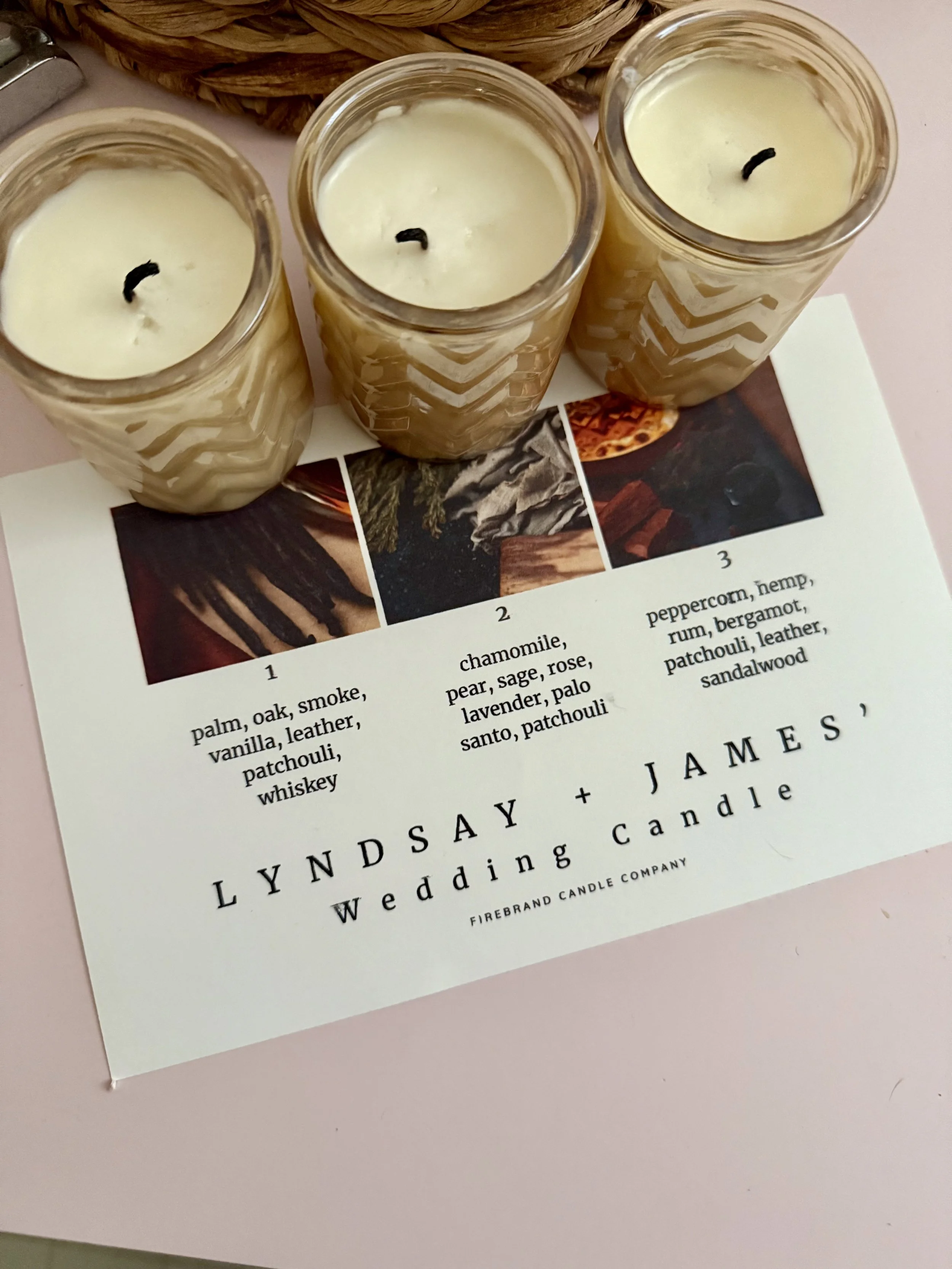 The most affordable option — I’ll work with you to get an idea of the type of scent you’re looking for or you can bring candles from other companies for inspiration and we can work together to create the candle for your event.